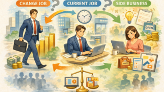 「転職すべきか、今の会社で頑張るべきか、副業を始めるべきか」──30代が直面するこの問いに、メリット・デメリット・向いている人の特徴を整理して答えます。年収・働き方・リスク・時間コストを多角的に比較。あなたにとって最適な選択肢を見つけるための判断基準が分かります。