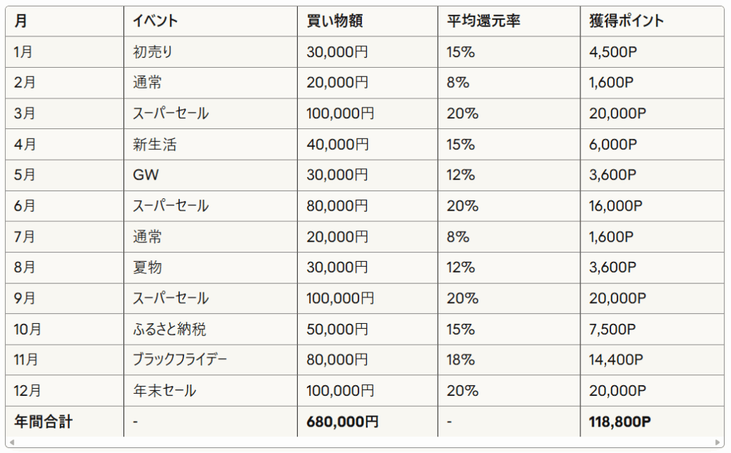 さらに上級者になると、お買い物マラソンやセールを駆使して年間10万〜30万ポイントを獲得している人もいます。