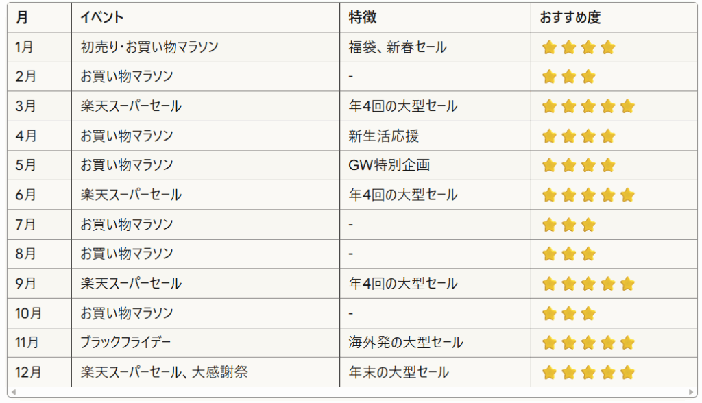 お買い物マラソン、楽天スーパーセール、5と0のつく日などのイベントを活用して、効率よくポイントを獲得しましょう。