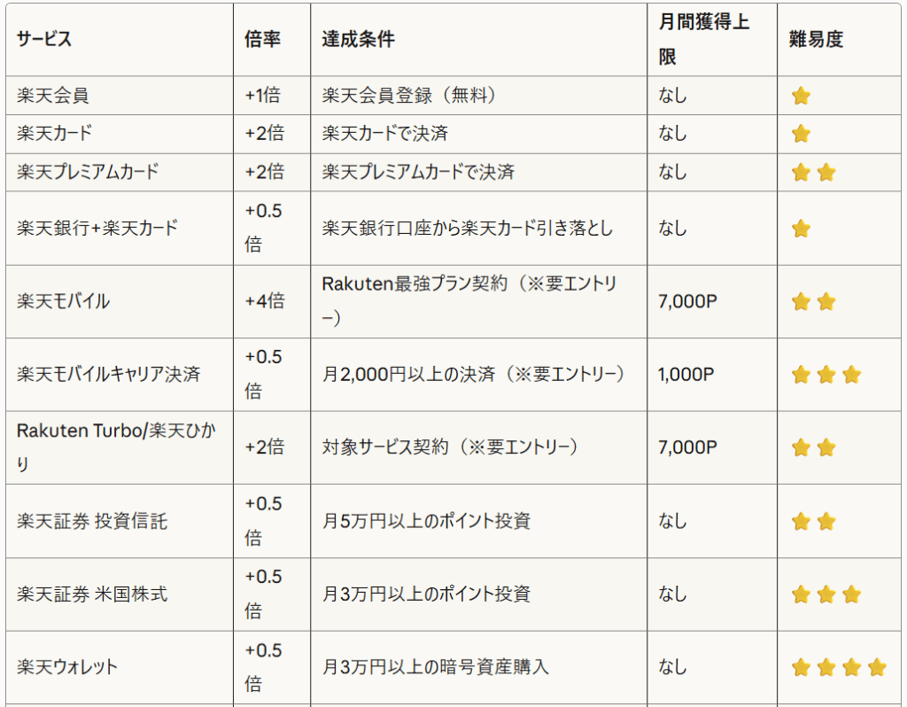 ✅ ポイントが貯まりやすい:最大18倍のポイント還元 ✅ ポイントが使いやすい:1ポイント単位で様々な場所で利用可能 ✅ 固定費も対象:携帯代、電気代、保険料などでもポイントが貯まる ✅ サービスが豊富:生活のほぼすべてを楽天で完結できる ✅ 初心者にやさしい:アプリが使いやすく、キャンペーンも分かりやすい
