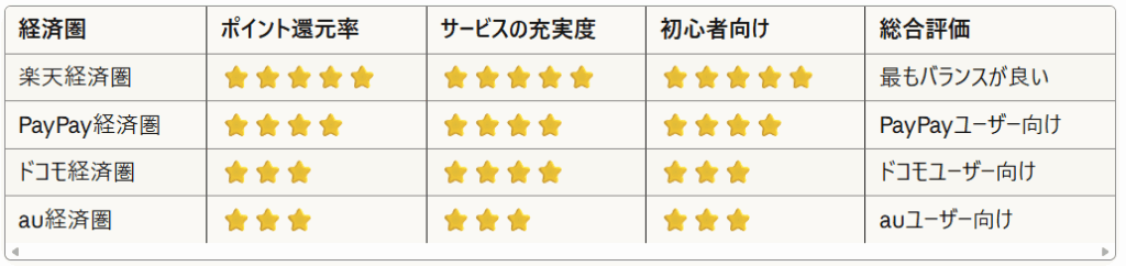 楽天経済圏はサービスの種類が最も豊富で、ポイント還元率も高く、初心者でも始めやすいのが特徴です。