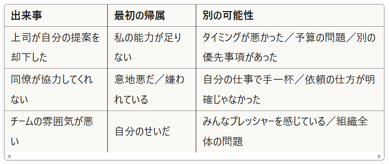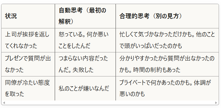 心理学的背景: 認知行動療法(CBT)の中核となる技法です。私たちは出来事そのものではなく、その「解釈」によってストレスを感じています。同じ出来事でも、どう解釈するかで感情は大きく変わるのです。