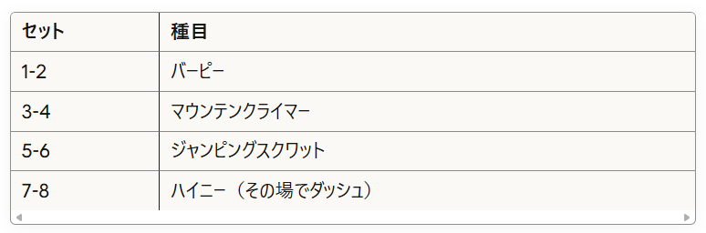 時間: 3分間 × 2セット(セット間の休憩1分)