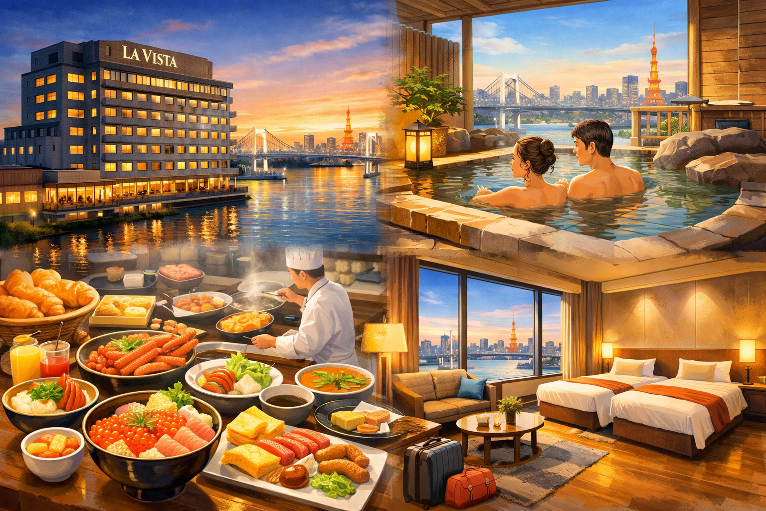 「ラビスタ(La Vista)」とはスペイン語で「眺望」を意味します。その名の通り、このホテルの最大の魅力は、東京湾と都心の高層ビル群が織りなす圧巻の景色。特に最上階14階の天然温泉大浴場から眺める夜景は、まるで宝石箱をひっくり返したような美しさだと評判です✨